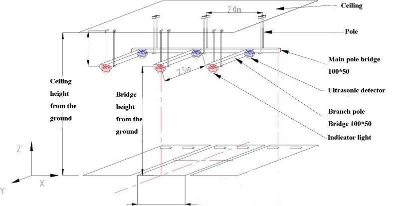 The split parking indicator is installed above the parking line. The horizontal distance from the parking line is 0 ~ 1 m, recommended 0.3 ~ 0.5 m; the installation height is between 2 and 3 meters, the recommended installation height is 2.5 meters
